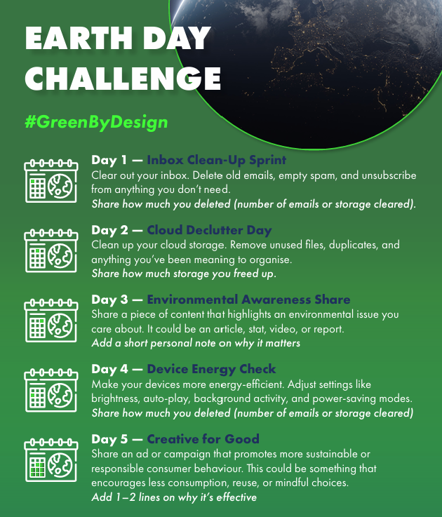 This year, our Sustainability Standards Committee is launching the #GreenByDesign Earth Day Challenge - a simple, practical five-day initiative designed to help you shrink your digital footprint.