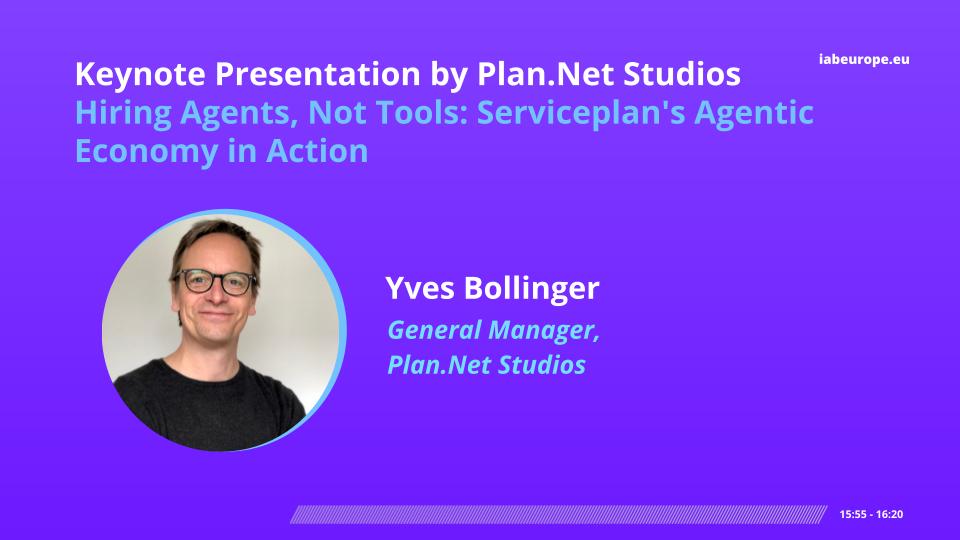 Plan.Net Studios then delivered their keynote, presented by Yves Bollinger, General Manager, also featuring a live demonstration. The session showcased how Serviceplan Group is rethinking AI adoption by treating agents not as tools, but as collaborators.