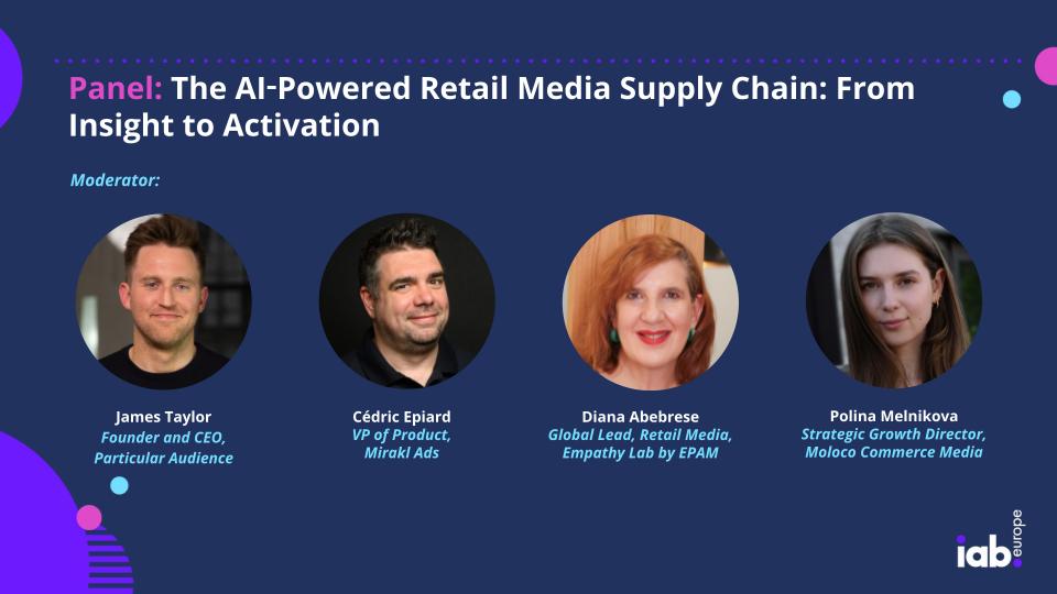 Moderated by James Taylor (Particular Audience), the first panel brought together Cédric Epiard (Mirakl Ads), Diana Abebrese (Empathy Lab by EPAM), and Polina Melnikova (Moloco Commerce Media) to explore how AI is transforming the retail media supply chain, from insight through to real-time activation.