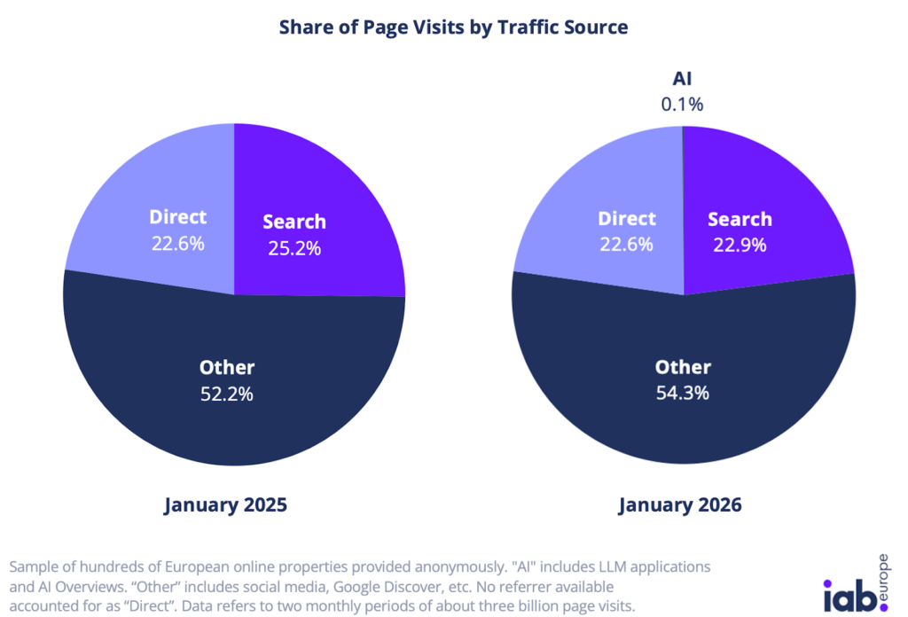 This report draws on a substantial sample of traffic data from hundreds of European websites that rely on advertising for at least a portion of their funding. While not exhaustive of the European publishing landscape, the dataset provides directional insight into emerging traffic patterns and helps establish a foundation for future research within the IAB Europe Publisher Content & AI Task Force.