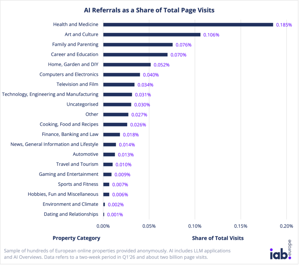 One emerging factor in this evolving discovery landscape is referral traffic generated directly by AI applications. Although still small in relative terms, AI referrals are now observable across multiple publisher categories, possibly indicating the early formation of a new acquisition channel.